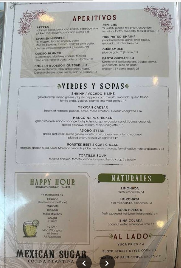 Mexican Sugar is open on Monday, Tuesday, Wednesday and Thursday from 11:00 AM - 10:00 PM; Friday from 11:00 AM - 11:00 PM; Saturday from 10:00 AM - 11:00 PM; Sunday from 11:30 AM - 9:15 PM.